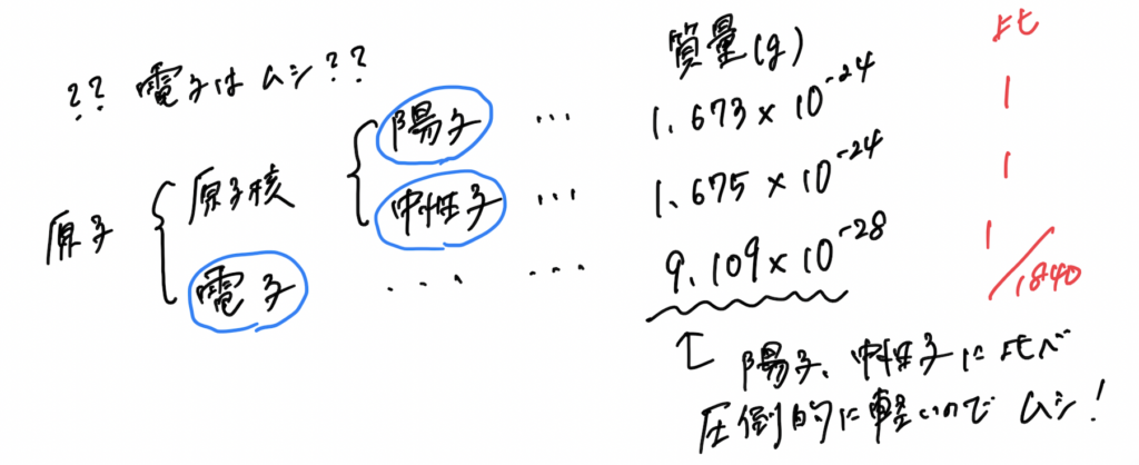 陽子や中性子に比べ、電子はとてつもなく軽い粒です。その比、約1840分の1!!