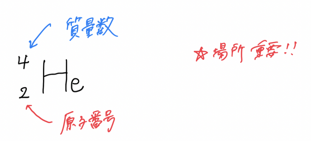 その原子の質量数や原子番号などは、次のように表記するよう国際的に決まっているので、覚えておいてください。