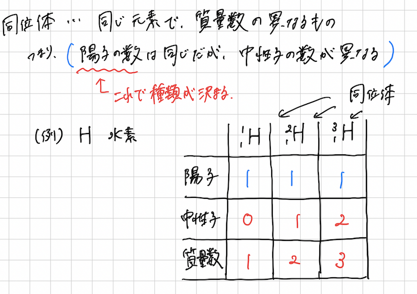 つまり、原子の種類、水素とか酸素とかというのは陽子の数で決まるので、同じ水素原子でも、実は重さの違う奴もいるんだよーってことです。