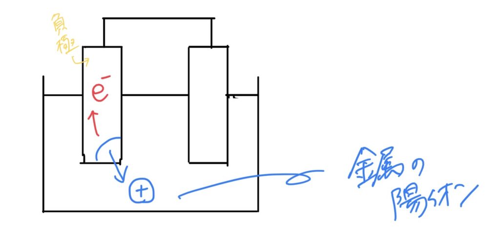 イオン化傾向の大きな金属が、電子を放出し、イオンになる。また、こちらの電極(金属)を負極と呼ぶ。