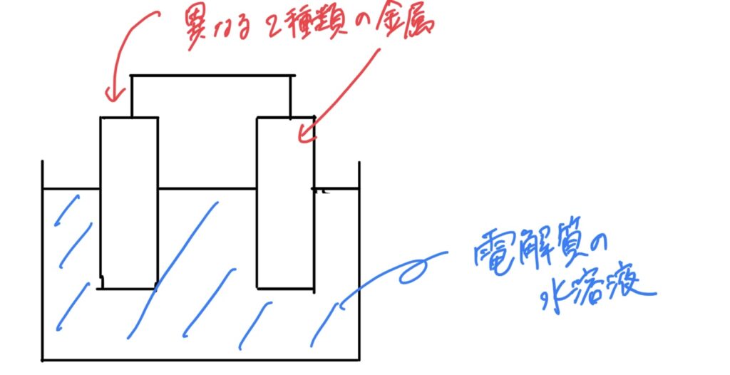 2種類の金属と、電解質の水溶液