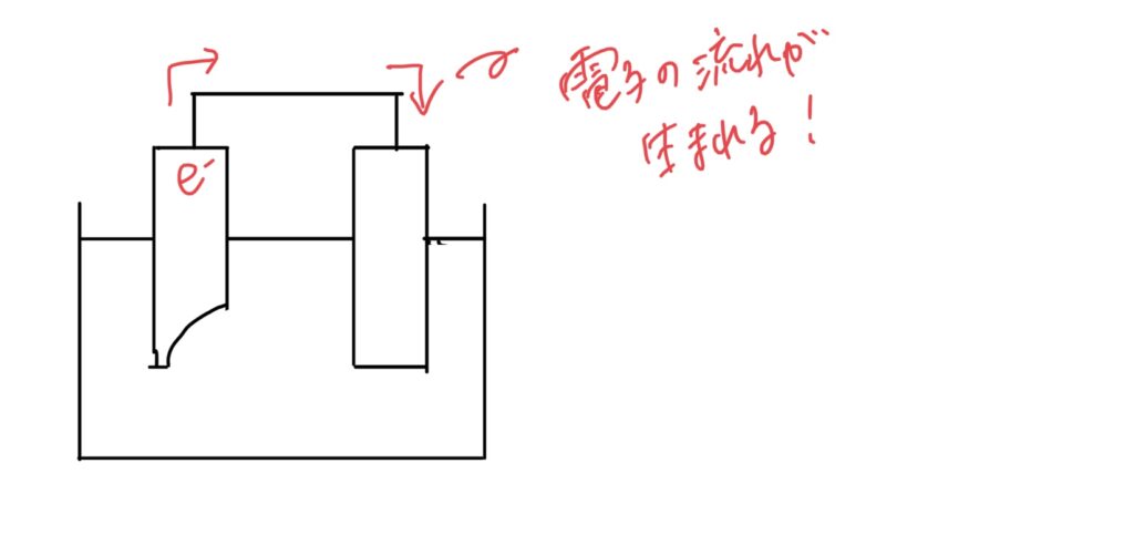 上記の模式的な電池の構造により、電流を発生させる(言い換えると、電子の流れを作り出す)しくみは、次のとおりになります。