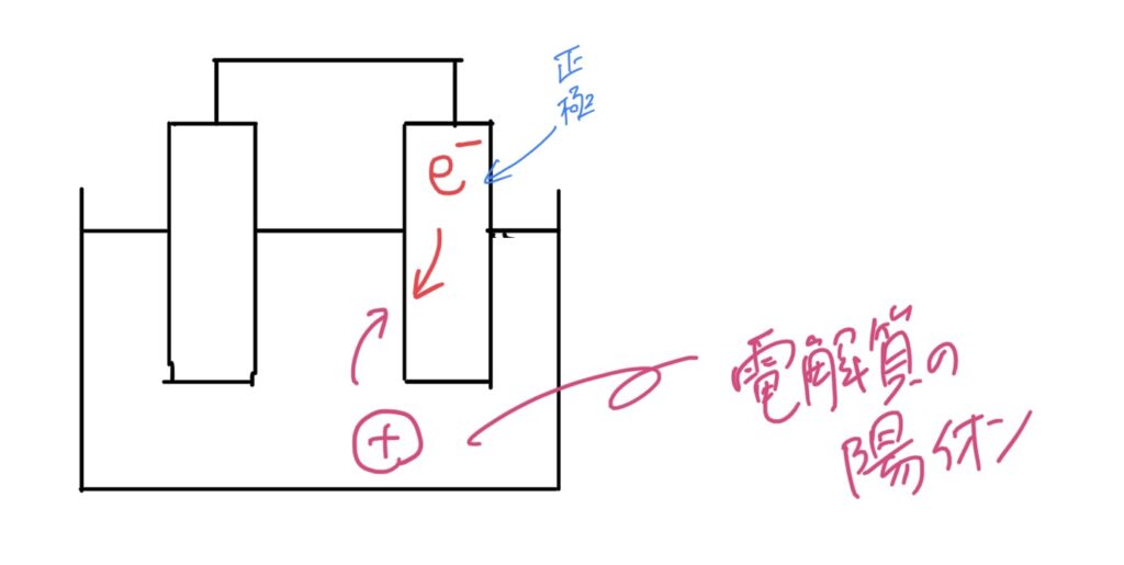 ③流れてきた電子が電解質の陽イオンに受け取られる。こちらの電極を正極と呼ぶ。