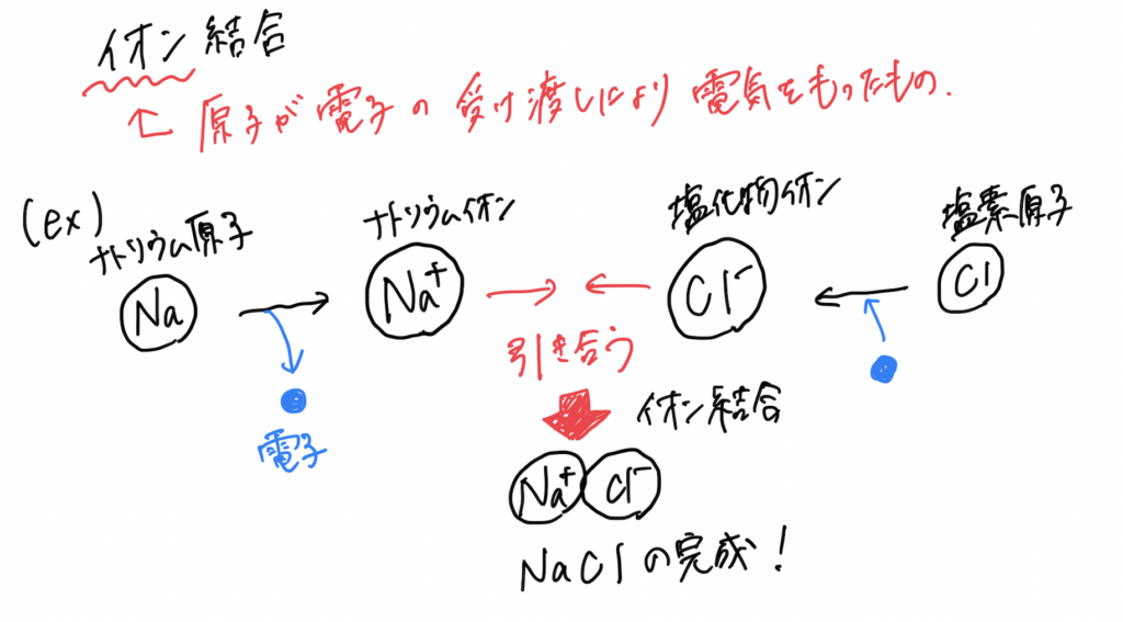 イオン結合:静電気力(+の電気、ーの電気)による引力で結びつく。