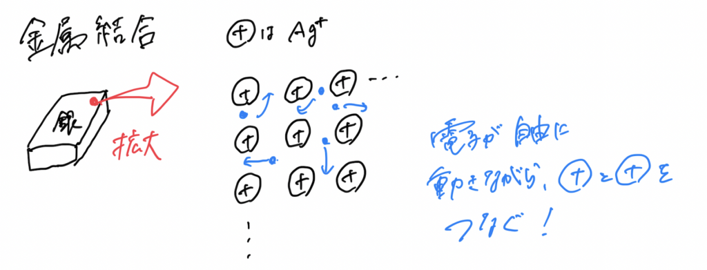 金属結合 :金属元素が陽イオンになり、放出した電子が陽イオン間を自由に動き回り(自由電子)、結びつける。