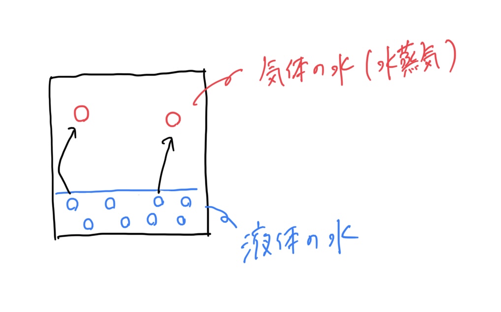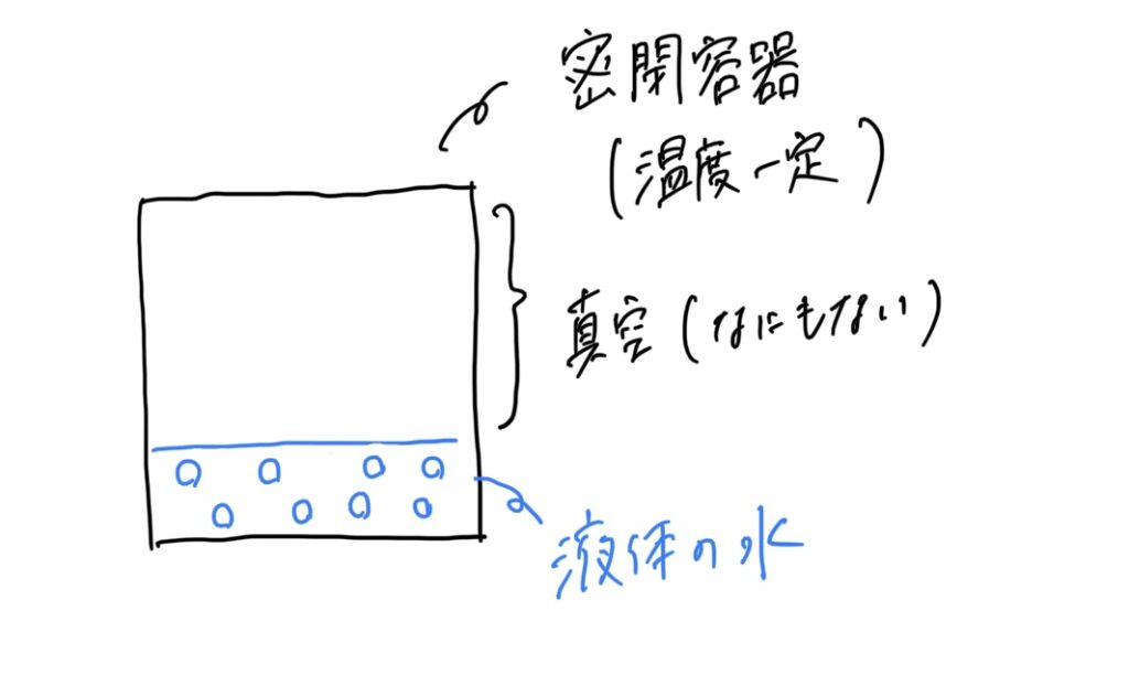 例えば、ある温度に保たれた密閉された容器の中に、水を入れて空気を抜き、一定時間放置するとどうなると思いますか。