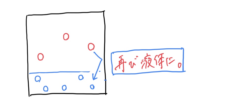 気体となった粒が増えてくると、中には、図のように、再び液体の方にダイブする粒も出てきます。