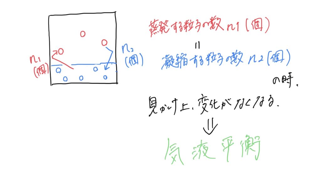 つまり、液体→気体(蒸発)と、気体→液体(凝縮)が同時に起こるようになり、