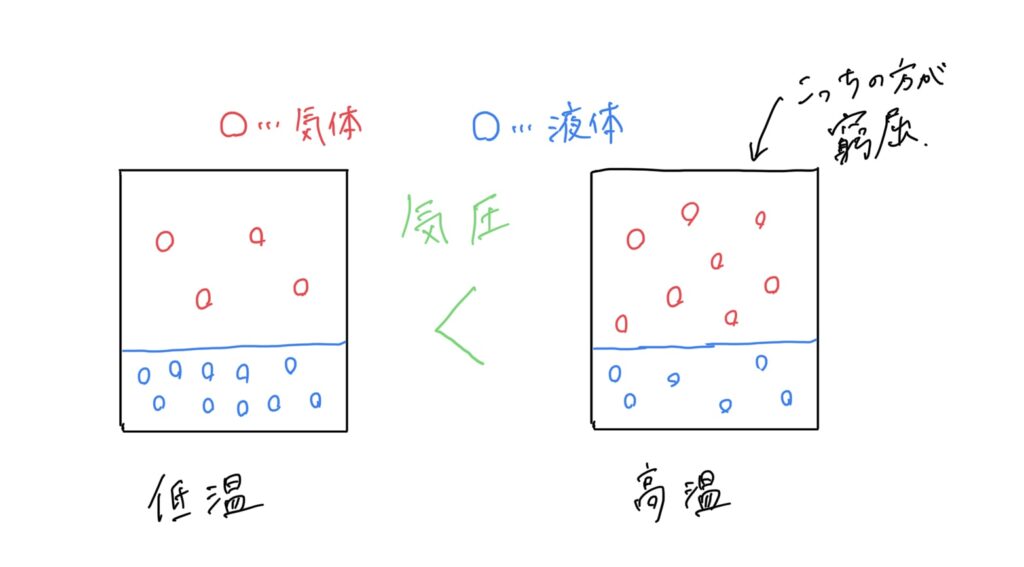温度高いほど、たくさん蒸発してくる→同じ体積中の粒の数が多い(窮屈)→気圧が大きい