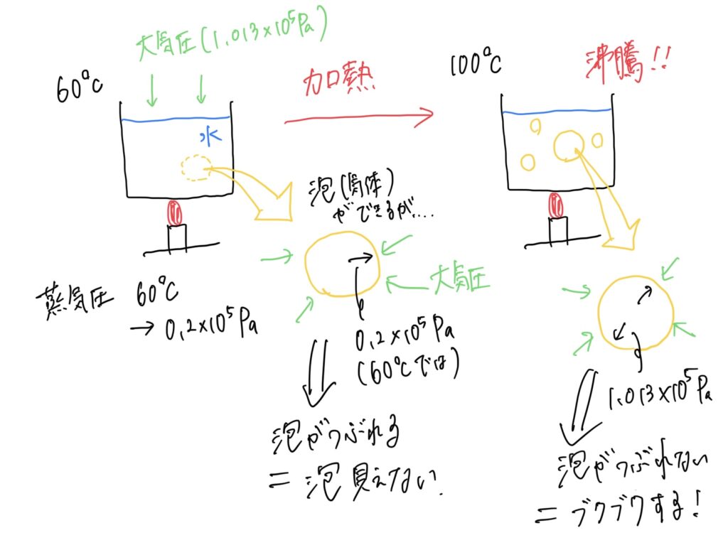 対して沸騰は、蒸気圧と大気圧が一致した( または蒸気圧が大気圧を超えた)状態変化で蒸発している様子のことです。
