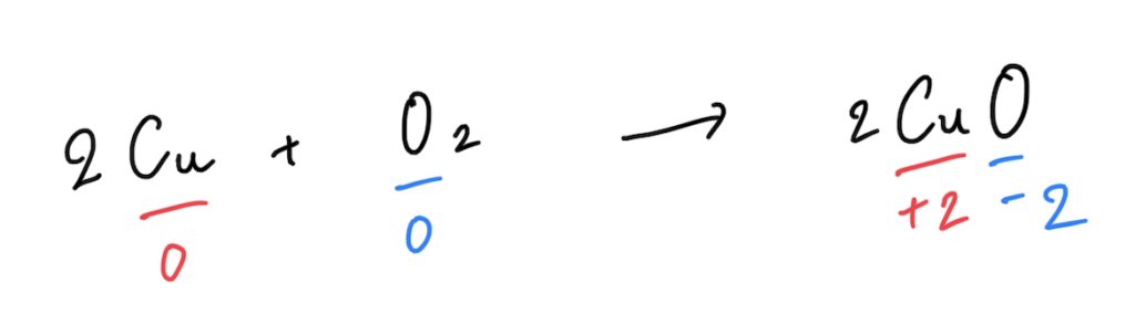 この反応の中では、酸素原子に注目すると、銅Cuが酸化され、酸素O2が還元されています。